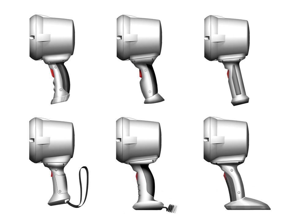 The light comes in surface mount and hand held versions as well as versions intended for land use that come in a standard black color. Below are a series of sketches showing handle alternatives that were considered during development. |